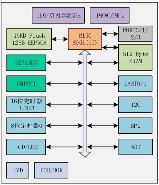 采用1T 8051內核,時鐘頻率最高可達33MHz,同時具備低功耗模式,動態(tài)功耗低至0.18mA/MHz。