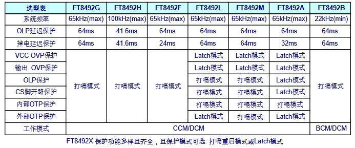 在保護功能方面,F(xiàn)T8492系列芯片提供了多種保護機制,且保護模式可選。例如,其過載保護(OLP)和輸出過壓保護(OVP)可選擇打嗝模式或Latch模式,以適應不同的應用場景和設(shè)計需求。打嗝模式在故障發(fā)生時會自動重啟芯片,而Latch模式則會鎖定故障狀態(tài),直到故障排除后重新啟動。這種靈活的保護模式選擇,為設(shè)計人員提供了更大的靈活性,能夠根據(jù)具體應用需求優(yōu)化保護策略。