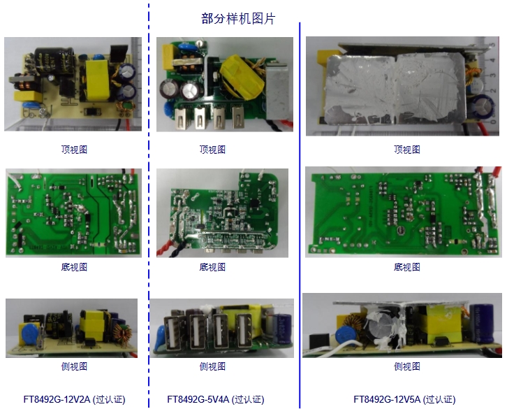 FT8492G作為該系列的典型型號,已經(jīng)成功應用于多種適配器設(shè)計中。例如,F(xiàn)T8492G-12V2A、FT8492G-5V4A和FT8492G-12V5A等樣機均已通過相關(guān)認證。這些樣機的性能表現(xiàn)優(yōu)異,不僅在效率上達到了DoE/CoC六級標準,還在實際使用中表現(xiàn)出良好的穩(wěn)定性和可靠性。