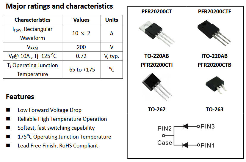 在中大功率開關(guān)電源、PFC 升壓電路或逆變器次級整流中,總有一顆“黑扁”TO-220 封裝器件被工程師們反復(fù)提到——它就是 PFR20200CTF。很多人第一次聽到這個料號時都會疑惑:它到底是三極管還是 MOS?其實(shí),它是一顆把“肖特基”和“MOS 結(jié)構(gòu)”揉在一起的功率整流二極管,由 PFC Device Inc. 推出,主打 200 V/20 A、超低正向壓降(Low VF)和快恢復(fù)特性,下面帶你一次性把它摸透。