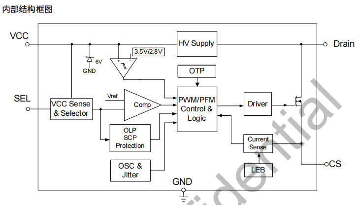 芯片上電后,內(nèi)部500 V高壓恒流源先把VCC沖到3.5 V,啟動完成后高壓源關(guān)斷,由輸出電壓經(jīng)電感耦合給VCC續(xù)電,實現(xiàn)“零輔助繞組”反激式供電;同時采樣VCC跌落,一旦低于3.0 V(3.3 V版本)并持續(xù)160 ms,判定輸出過載,進入4 kHz打嗝模式,1.6 s自動重啟。峰值電流比較器僅200 mV閾值,配合250 ns前沿消隱,既能精確限流又不怕DRAIN尖峰誤觸發(fā)。溫度檢測位于MOS柵極區(qū),熱阻155 °C/W,確保芯片在塑料外殼密閉環(huán)境下也能安全降額。