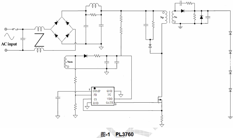 PL3760具備全面的保護功能,包括LED開路/短路保護、逐周期限流、VCC欠壓/過壓保護以及過溫保護。這些保護功能不僅提高了系統(tǒng)的安全性,還延長了LED燈具的使用壽命。