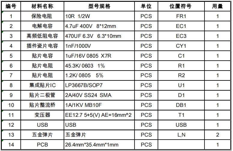物料清單是實(shí)現(xiàn)電路設(shè)計(jì)的基礎(chǔ),它詳細(xì)列出了電路中所使用的各種元件及其規(guī)格型號(hào)。在 LP3667B 5V1A 充電器的 BOM 表中,涵蓋了保險(xiǎn)電阻、電解電容、高頻低阻電容、瓷片電容、貼片電阻、集成貼片 IC、貼片二極管、貼片整流橋、變壓器、USB 接口、五金彈片以及 PCB 等多種元件。例如,保險(xiǎn)電阻采用 10R 1/2W 的規(guī)格,用于電路的過流保護(hù);電解電容選用 4.7uF 400V 的型號(hào),用于輸入濾波;高頻低阻電容則采用 470uF 6.3V 的規(guī)格,用于輸出濾波,以降低輸出紋波。這些元件的合理選型和搭配,共同構(gòu)成了一個(gè)高效、穩(wěn)定的充電器電路。