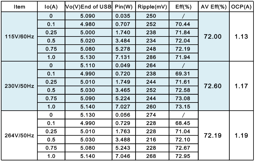 效率是衡量充電器性能的重要指標(biāo)之一。根據(jù)測試數(shù)據(jù),在不同輸入電壓和負(fù)載條件下,該充電器的效率表現(xiàn)較為出色。例如,在輸入電壓為 115Vac/60Hz 時(shí),滿載效率達(dá)到 72.00%;而在輸入電壓為 230Vac/50Hz 時(shí),滿載效率為 72.60%。這表明充電器在不同工作條件下都能保持較高的轉(zhuǎn)換效率,減少了能量損耗,提高了能源利用率。