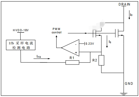 通過高壓 MOS 的電流 ID分成兩個部分,其中一部分為 IS,這部分電流為芯片采樣電流。IS與 ID成比例關(guān)系: