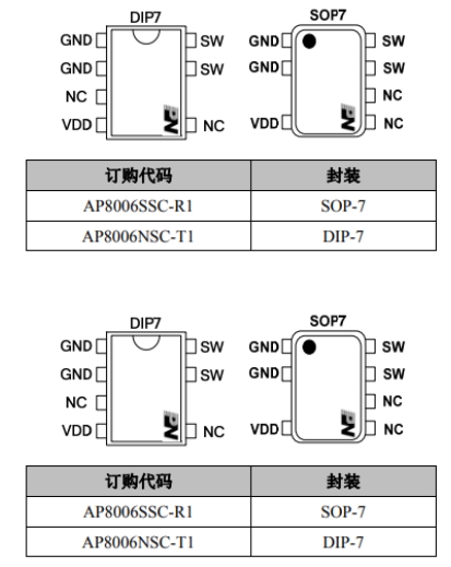 AP8006采用SOP-7封裝形式,這種封裝方式具有體積小、散熱性能好等優(yōu)點,適合在緊湊的電路板上使用。在訂購時,用戶可以根據(jù)實際需求選擇不同的封裝形式和規(guī)格型號。例如,AP8006SSC-R1是其中一種型號,適用于小家電電源芯片IC。