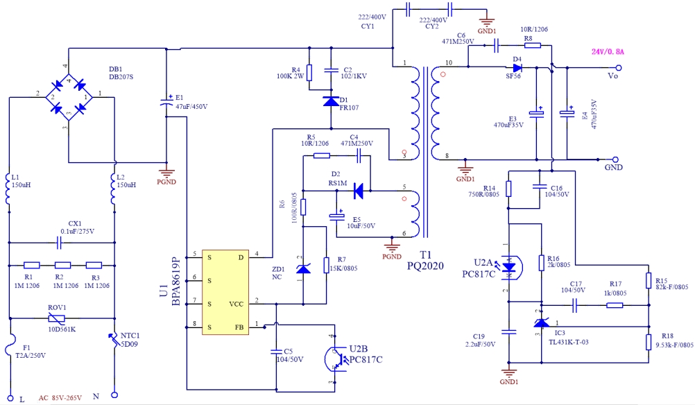BPA8619P 的電路圖是整個電源方案的核心,它詳細展示了電源電路的各個組成部分以及它們之間的連接關(guān)系。從電路圖中可以看出,該電源采用了典型的反激式開關(guān)電源拓撲結(jié)構(gòu),這種結(jié)構(gòu)具有電路簡單、成本較低、易于實現(xiàn)等優(yōu)點,同時也能滿足較高的性能要求。