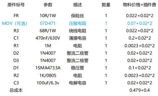 從 BOM 方案及成本來看,YD925 方案的物料種類大幅減少,且大多為貼片元件,尺寸小,可實(shí)現(xiàn)全貼片加工,極大地降低了生產(chǎn)成本和體積。以一個典型的 5V 輸出供電方案為例,YD925 的外圍電路簡潔明了,主要包括壓敏電阻(可選)、整流二極管、電解電容等常見元件,總成本(不包含芯片)僅為 0.202 元,相比傳統(tǒng)阻容降壓方案的 0.479+0.4 元,成本優(yōu)勢不言而喻。