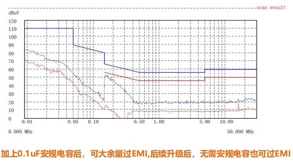 在實(shí)際應(yīng)用中,布板的合理性和電磁兼容性(EMI)測試是電源設(shè)計(jì)中不可忽視的重要環(huán)節(jié)。YD925 的布板示例表明,其電路布局簡潔明了,元件排布緊湊合理,不僅節(jié)省了 PCB 空間,還便于生產(chǎn)制造和后期維護(hù)。在 EMI 測試方面,YD925 的表現(xiàn)同樣出色。經(jīng)過測試,YD925 供電方案在加上 0.1uF 安規(guī)電容后,可大余量過 EMI。而且,后續(xù)升級后,無需安規(guī)電容也可過 EMI,這無疑為產(chǎn)品的設(shè)計(jì)和認(rèn)證提供了極大的便利,進(jìn)一步降低了產(chǎn)品的設(shè)計(jì)成本和復(fù)雜度。