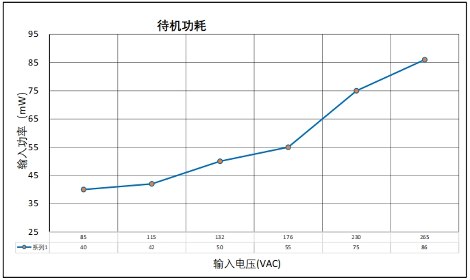 從圖中可以看出,BP86513D在不同輸入電壓下的待機功耗均低于100mW,符合節(jié)能標準。