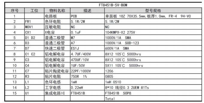 FT8451B的物料清單簡(jiǎn)潔明了,主要包括以下幾個(gè)關(guān)鍵元件: