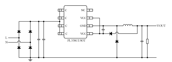 PL3383T的輸出電路設(shè)計簡潔高效,其典型應(yīng)用電路如下圖所示: