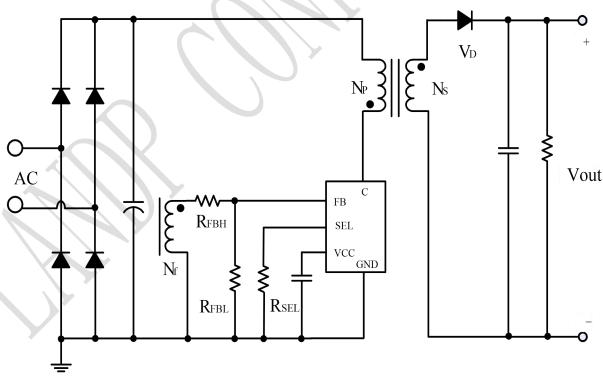 峰值電流設(shè)置通過(guò)SEL腳外接電阻RSEL實(shí)現(xiàn),可調(diào)最大峰值電流IPKMAX。恒流控制和輸出恒流電流設(shè)置通過(guò)檢測(cè)電感的峰值電流實(shí)現(xiàn),當(dāng)原邊電感中的實(shí)時(shí)電流大于芯片設(shè)定的最大峰值電流IPKMAX時(shí),功率管關(guān)斷。輸出電流IOUT與變壓器的匝數(shù)比、峰值電流和退磁時(shí)間等因素有關(guān)。