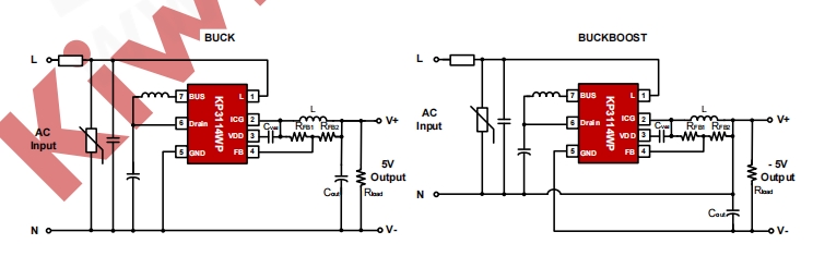 KP3114WPA適用于多種小功率電源應(yīng)用,如小家電電源、USB充電器等。以下是兩種典型的電路應(yīng)用示例: