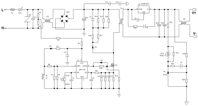 原邊電路:LP8773S直接驅(qū)動(dòng)MOSFET,無(wú)需光耦反饋,節(jié)省1顆光耦+TL431。