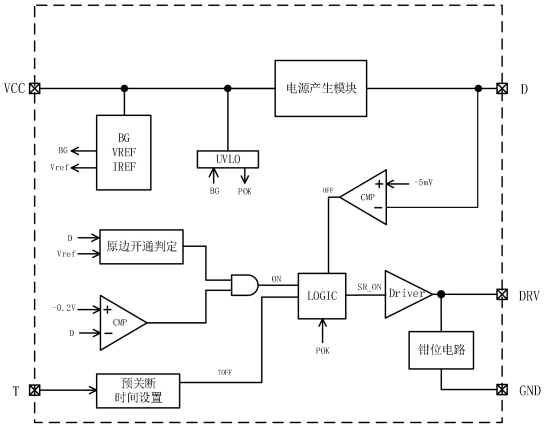 這些模塊協(xié)同工作,實(shí)現(xiàn)了從電源輸入到同步整流MOS管驅(qū)動(dòng)的完整控制流程。其中,電源產(chǎn)生模塊為芯片提供穩(wěn)定的VCC供電;原邊開(kāi)通判定模塊通過(guò)檢測(cè)漏極電壓的變化率和幅度,精準(zhǔn)判斷同步整流管的開(kāi)通時(shí)刻;鉗位電路則確保VCC電壓不會(huì)超過(guò)安全范圍;預(yù)關(guān)斷時(shí)間設(shè)置模塊通過(guò)T腳外接電阻實(shí)現(xiàn)死區(qū)時(shí)間的靈活調(diào)整;驅(qū)動(dòng)邏輯模塊則根據(jù)各模塊的信號(hào)輸出,精確控制DRV腳的驅(qū)動(dòng)信號(hào),實(shí)現(xiàn)同步整流MOS管的高效導(dǎo)通與關(guān)斷。