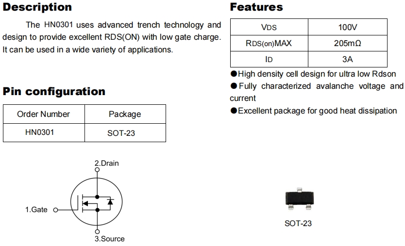 在 60 W 以下的開(kāi)關(guān)電源、馬達(dá)驅(qū)動(dòng)或電池保護(hù)板上,工程師往往希望找到一顆“既耐壓又高開(kāi)關(guān)速度、同時(shí)封裝足夠小”的 MOSFET。華能(HN)推出的 HN0301 把 100 V 耐壓、205 mΩ 低導(dǎo)通電阻和 3 A 連續(xù)電流塞進(jìn)了一顆 SOT-23 三腳小封裝,成為 24 V 工業(yè)母線、12 V/24 V 汽車(chē)周邊、POE 受電設(shè)備等場(chǎng)景的新寵。本文結(jié)合原廠數(shù)據(jù)表與實(shí)測(cè)筆記,帶你1分鐘吃透這顆“迷你功率管”。